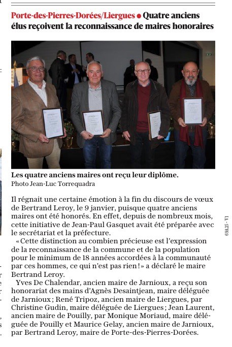 Les maires délégués des 3 villages et le maire de Porte des Pierres Dorées ont remis l’honorariat à René Tripoz de Liergues, Jean Laurent de Pouilly le monial, Yves de Chalendar de Jarnioux et Maurice Gelay de Jarnioux. Tous ont consacré au moins 18 ans de leur vie au service de leur village et de leurs citoyens. Un grand moment d’émotion pour les récipiendaires et leurs conjointes qui ont participé à leur manière en acceptant les contraintes de la fonction de leur mari. Encore merci à eux pour le dévouement dont ils ont fait preuve pour la communauté.